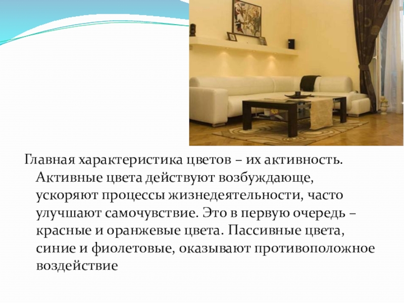 Слайд 2Главная характеристика цветов – их активность. Активные цвета действуют возбуждающе, ускоряют