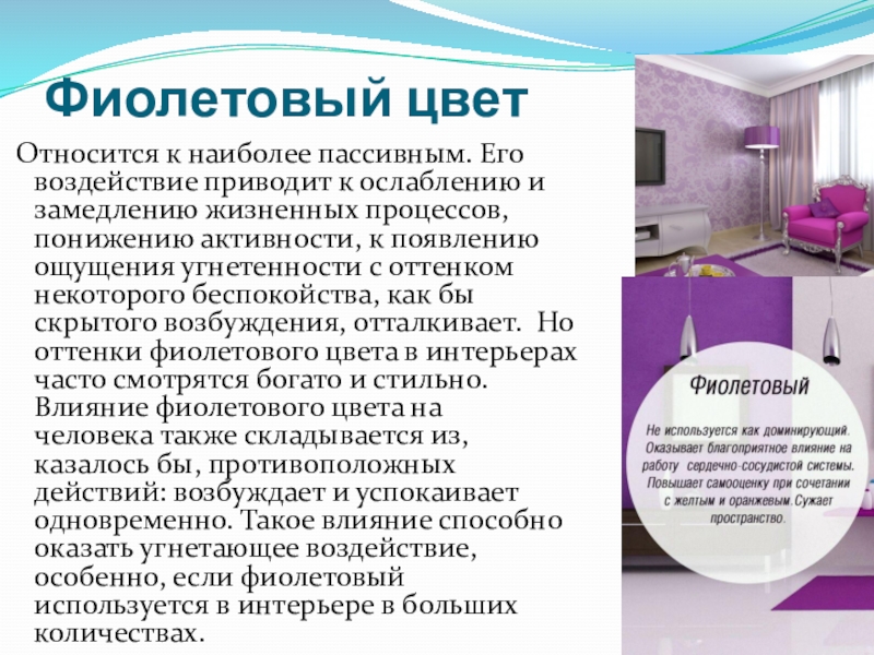 замедлению жизненных процессов, понижению активности, к появлению ощущения угнетенности с оттенком некоторого беспокойства, как бы скрытого возбуждения, отталкивает. Но оттенки фиолетового цвета в интерьерах часто смотрятся богато и стильно. Влияние фиолетового цвета на человека также складывается из, казалось бы, противоположных действий: возбуждает и успокаивает одновременно. Такое влияние способно оказать угнетающее воздействие, особенно, если фиолетовый используется в интерьере в больших количествах.