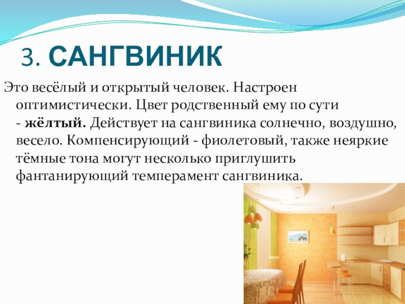 по сути - жёлтый. Действует на сангвиника солнечно, воздушно, весело. Компенсирующий - фиолетовый, также неяркие тёмные тона могут несколько приглушить фантанирующий темперамент сангвиника.