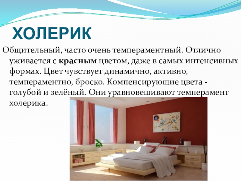формах. Цвет чувствует динамично, активно, темпераментно, броско. Компенсирующие цвета - голубой и зелёный. Они уравновешивают темперамент холерика.