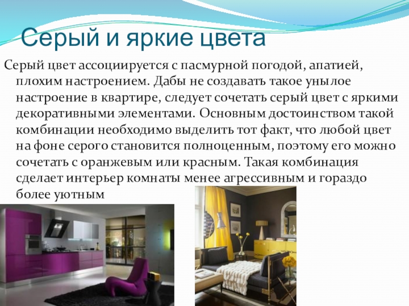 настроением. Дабы не создавать такое унылое настроение в квартире, следует сочетать серый цвет с яркими декоративными элементами. Основным достоинством такой комбинации необходимо выделить тот факт, что любой цвет на фоне серого становится полноценным, поэтому его можно сочетать с оранжевым или красным. Такая комбинация сделает интерьер комнаты менее агрессивным и гораздо более уютным
