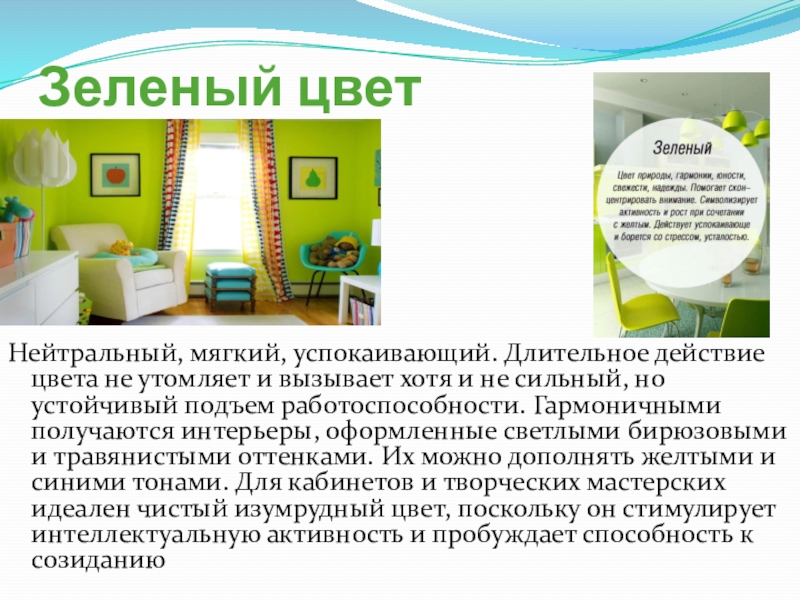 хотя и не сильный, но устойчивый подъем работоспособности. Гармоничными получаются интерьеры, оформленные светлыми бирюзовыми и травянистыми оттенками. Их можно дополнять желтыми и синими тонами. Для кабинетов и творческих мастерских идеален чистый изумрудный цвет, поскольку он стимулирует интеллектуальную активность и пробуждает способность к созиданию