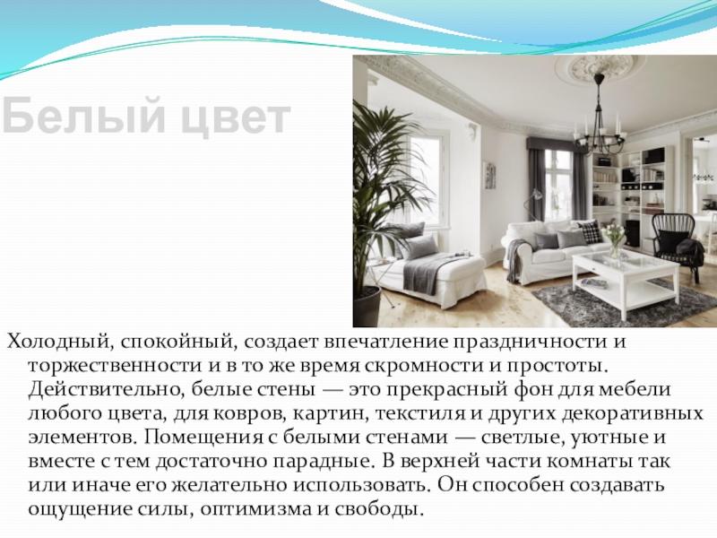 же время скромности и простоты. Действительно, белые стены — это прекрасный фон для мебели любого цвета, для ковров, картин, текстиля и других декоративных элементов. Помещения с белыми стенами — светлые, уютные и вместе с тем достаточно парадные. В верхней части комнаты так или иначе его желательно использовать. Он способен создавать ощущение силы, оптимизма и свободы.