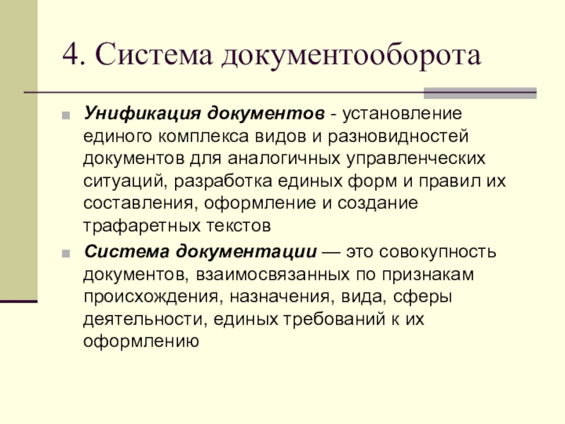 Система документации — это совокупность документов, взаимосвязанных по признакам происхождения, назначения, вида, сферы деятельности, единых требований к их оформлению