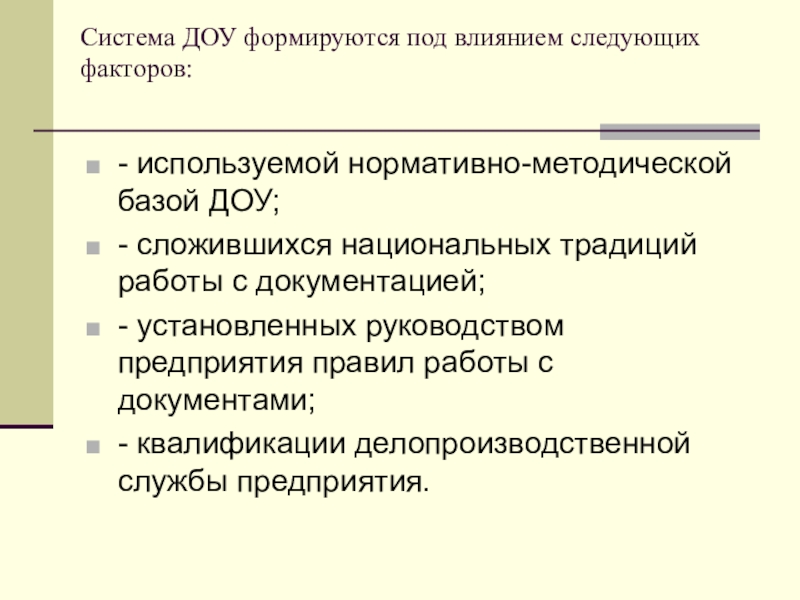 Слайд 5Система ДОУ формируются под влиянием следующих факторов: