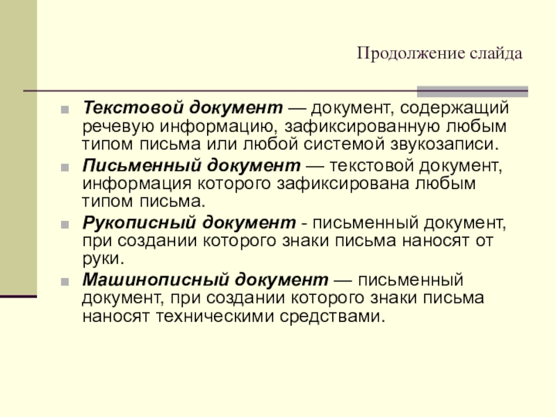 Текстовой документ — документ, содержащий речевую информацию, зафиксированную любым типом