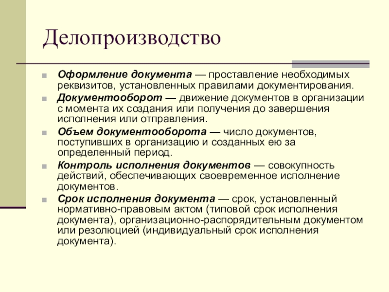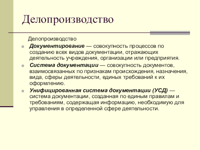 Делопроизводство (документационное обеспечение управления ДОУ) определяется стандартом как «отрасль деятельности, обеспечивающая документирование и организацию работы с документами», т.е. весь процесс от момента создания документа до его уничтожения или передачи на хранение в архив.