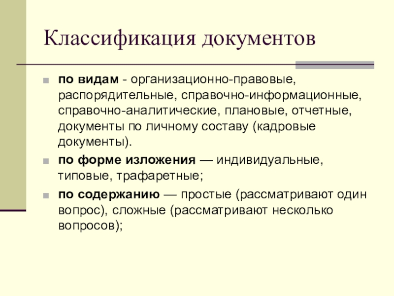 по видам - организационно-правовые, распорядительные, справочно-информационные, справочно-аналитические, плановые, отчетные, документы