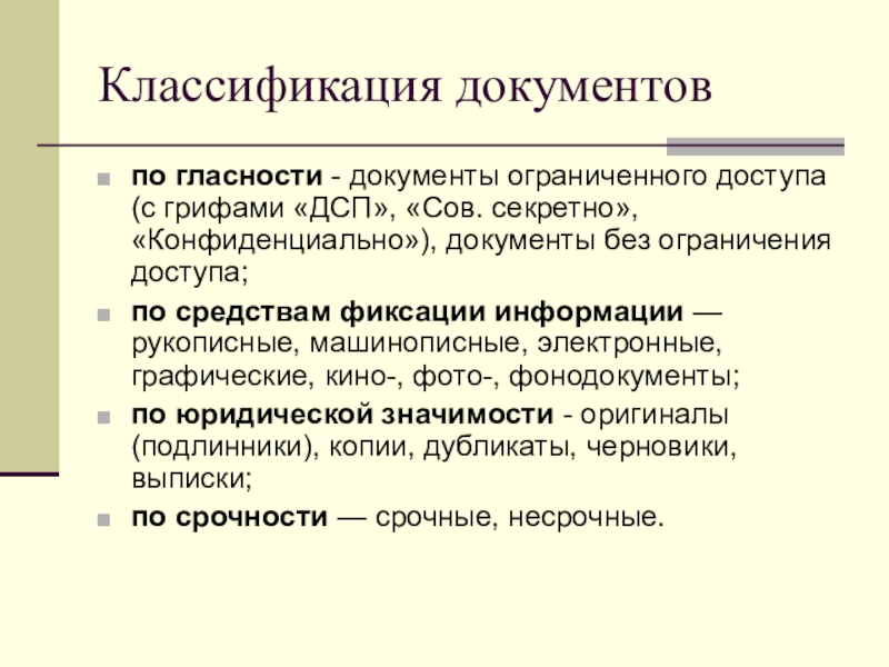 секретно», «Конфиденциально»), документы без ограничения доступа;