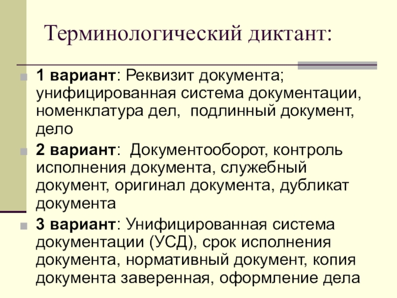 1 вариант: Реквизит документа; унифицированная система документации, номенклатура дел, подлинный