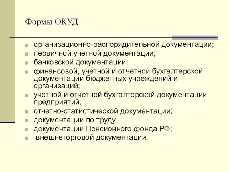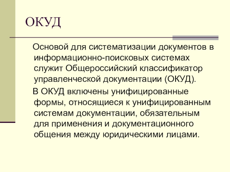 В ОКУД включены унифицированные формы, относящиеся к унифицированным системам документации, обязательным для применения и документационного общения между юридическими лицами.