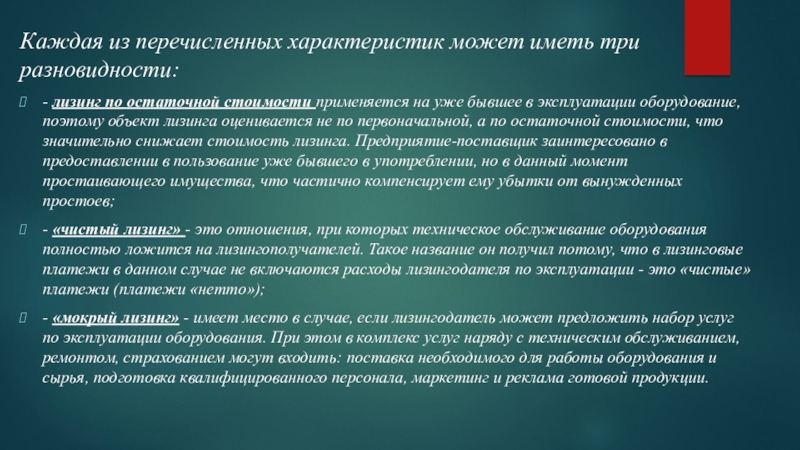 - «чистый лизинг» - это отношения, при которых техническое обслуживание оборудования полностью ложится на лизингополучателей. Такое название он получил потому, что в лизинговые платежи в данном случае не включаются расходы лизингодателя по эксплуатации - это «чистые» платежи (платежи «нетто»);