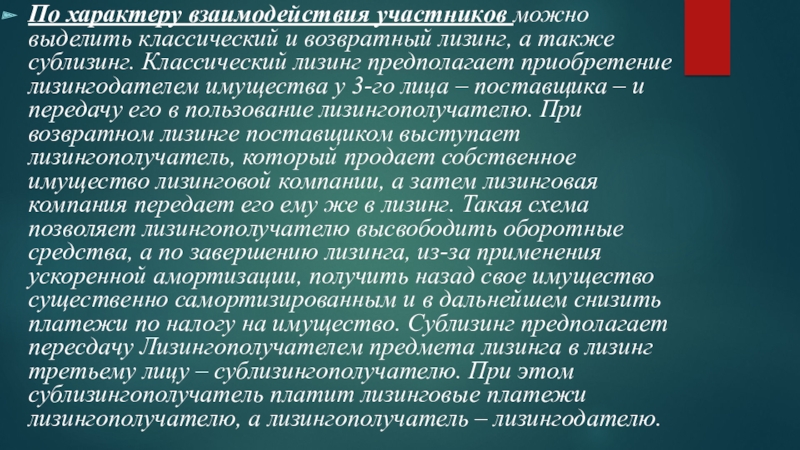 Слайд 16По характеру взаимодействия участников можно выделить классический и возвратный лизинг, а
