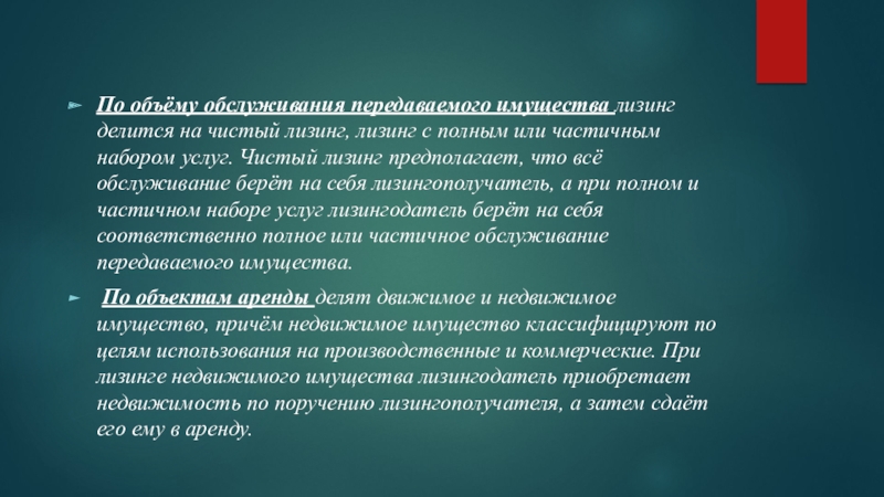 Слайд 14По объёму обслуживания передаваемого имущества лизинг делится на чистый лизинг, лизинг