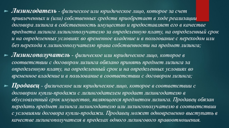 Слайд 7Лизингодатель - физическое или юридическое лицо, которое за счет привлеченных и