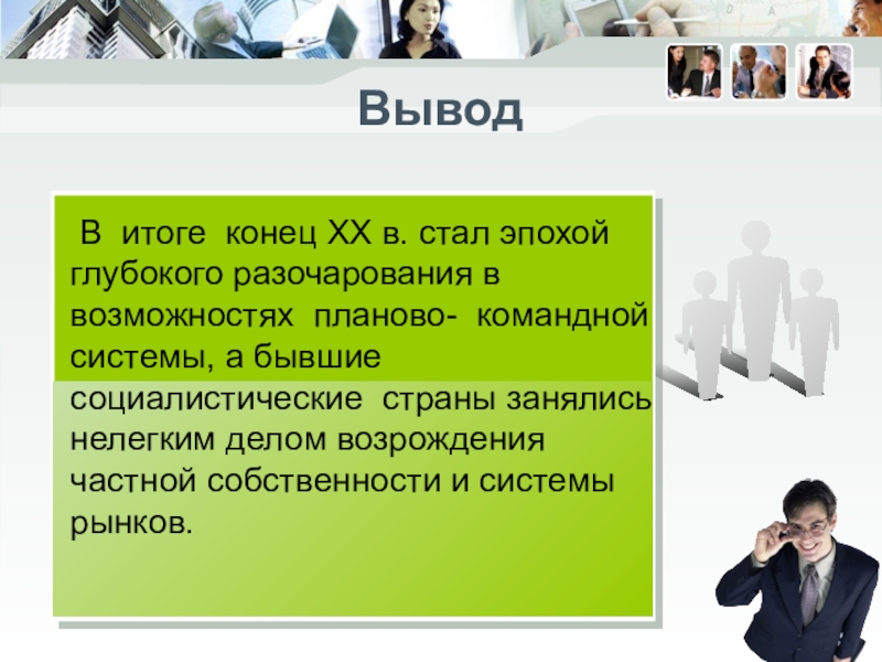 В итоге конец XX в. стал эпохой глубокого разочарования в возможностях планово- командной системы, а бывшие социалистические страны занялись нелегким делом возрождения частной собственности и системы рынков.