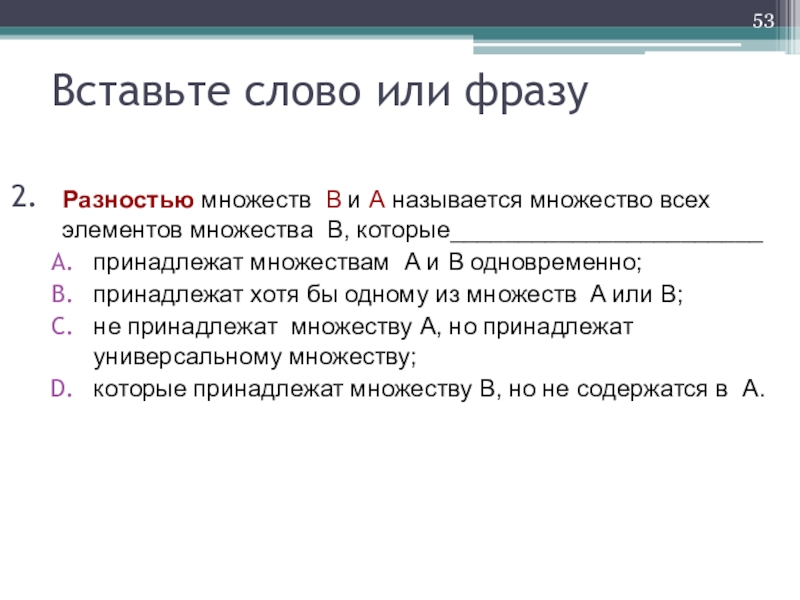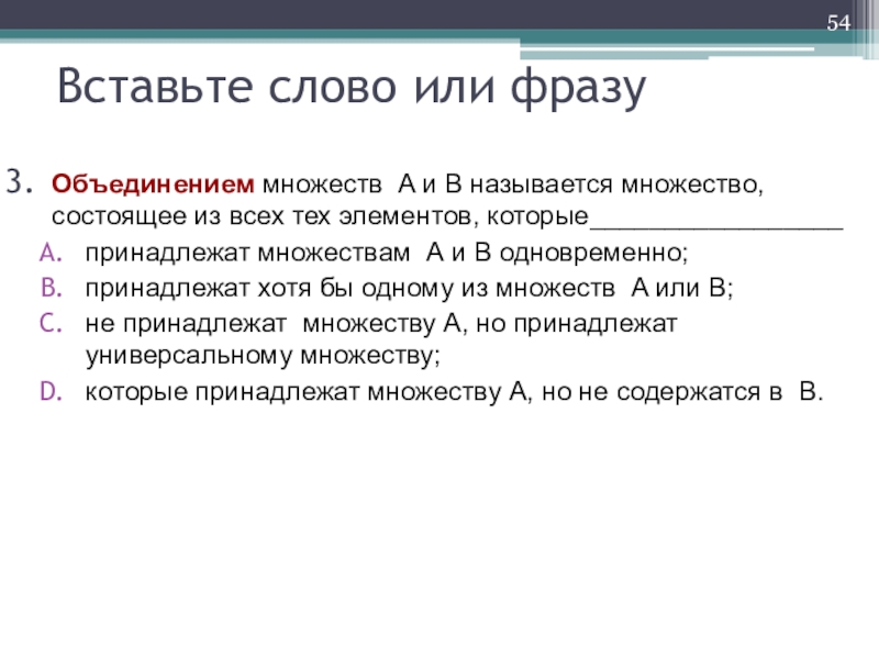 Объясните, почему выполняется равенство: 1) А=А ; 2) А А=А ; 3) А∩ = ; 4) А∩А=А.