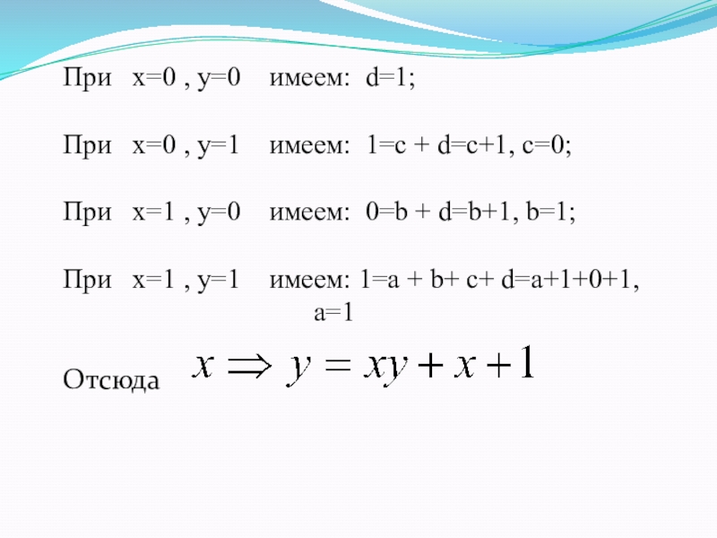 При x=1 , y=0 имеем: 0=b + d=b+1, b=1;