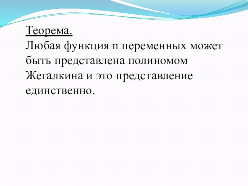 Теорема. Любая функция n переменных может быть представлена полиномом Жегалкина и это представление единственно.