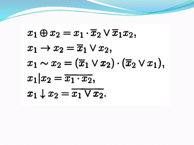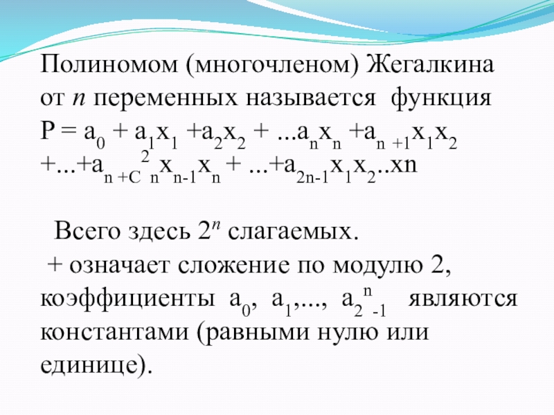 Полиномом (многочленом) Жегалкина от п переменных называется функцияP = a0 + a1x1 +a2x2 + ...anxn +an +1x1x2 +...+an +C2nxn-1xn + ...+a2n-1x1x2..xn Всего здесь 2п слагаемых. + означает сложение по модулю 2, коэффициенты  a0,  a1,...,  a2n-1  являются