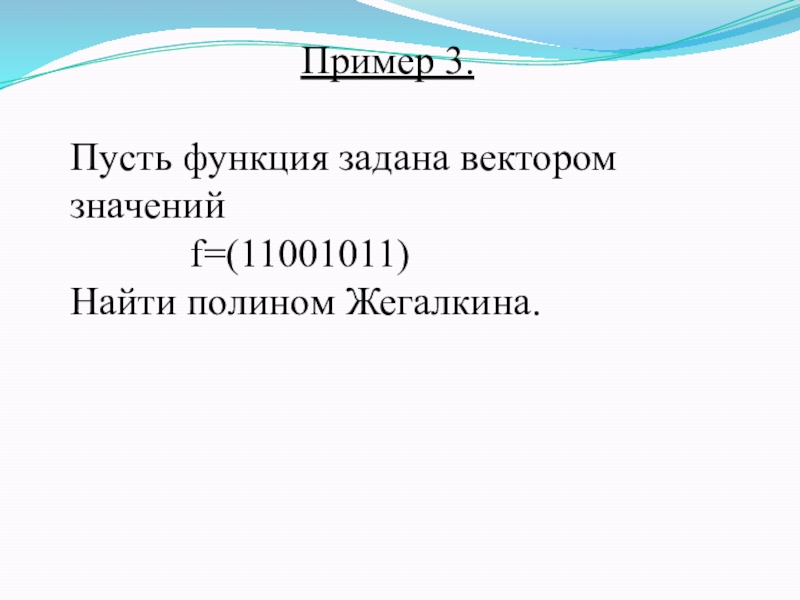 Пример 3.Пусть функция задана вектором значений			f=(11001011)Найти полином Жегалкина.