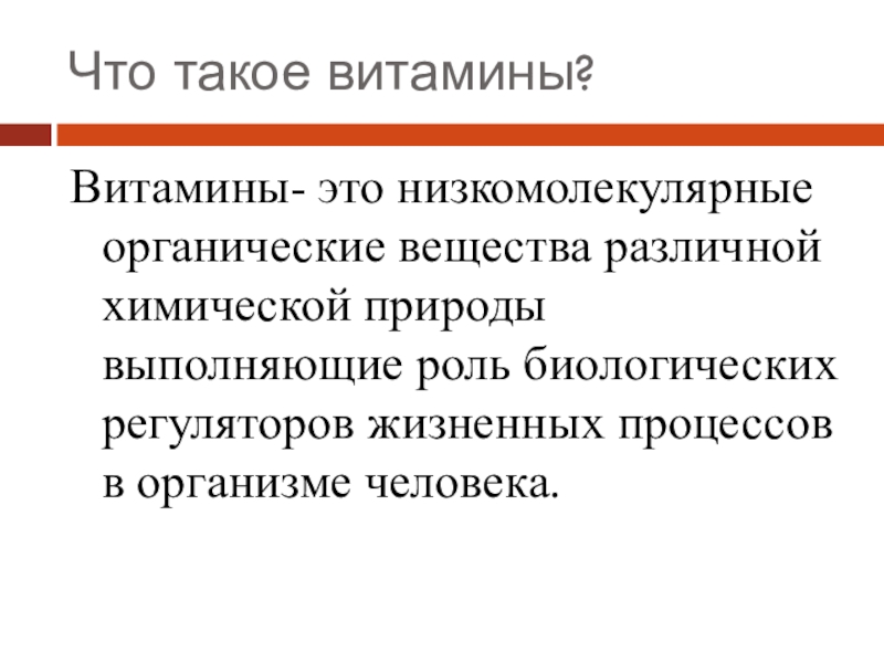 Что такое витамины?Витамины- это низкомолекулярные органические вещества различной химической природы выполняющие роль биологических регуляторов жизненных процессов в