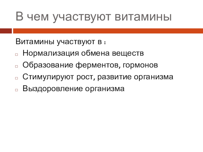 В чем участвуют витаминыВитамины участвуют в :Нормализация обмена веществОбразование ферментов, гормоновСтимулируют рост, развитие организмаВыздоровление организма