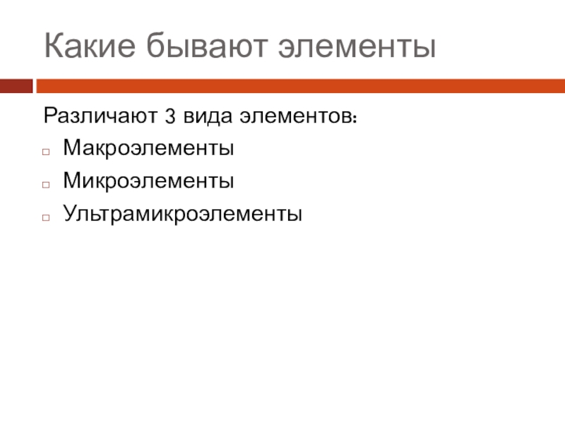 Какие бывают элементы Различают 3 вида элементов:Макроэлементы МикроэлементыУльтрамикроэлементы