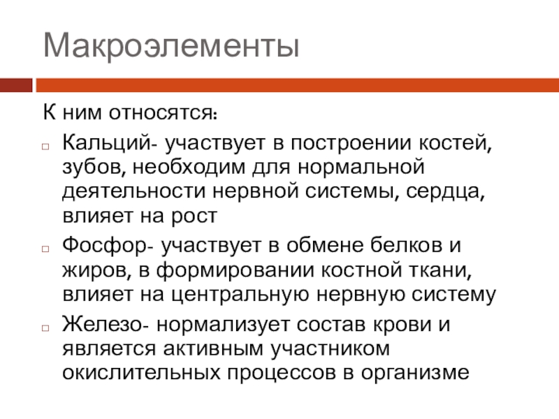 МакроэлементыК ним относятся:Кальций- участвует в построении костей, зубов, необходим для нормальной деятельности нервной системы, сердца, влияет на