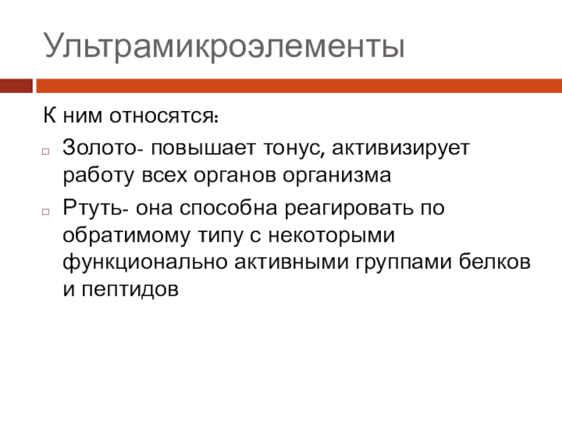 УльтрамикроэлементыК ним относятся:Золото- повышает тонус, активизирует работу всех органов организмаРтуть- она способна реагировать по обратимому типу с