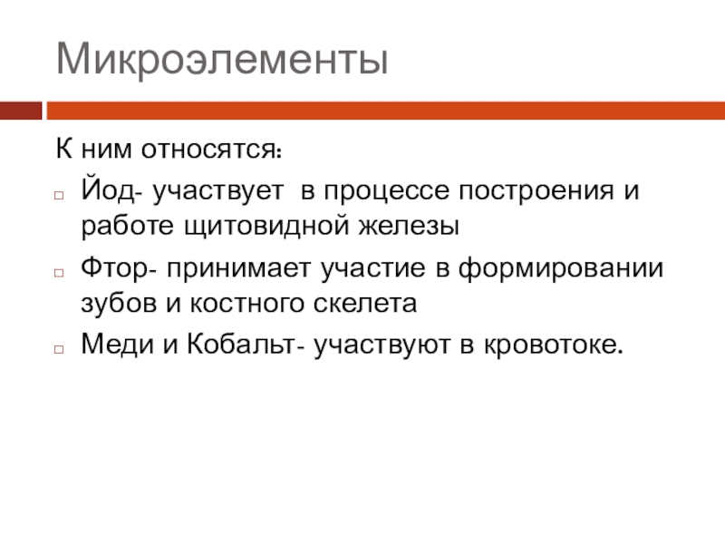МикроэлементыК ним относятся:Йод- участвует в процессе построения и работе щитовидной железыФтор- принимает участие в формировании зубов и