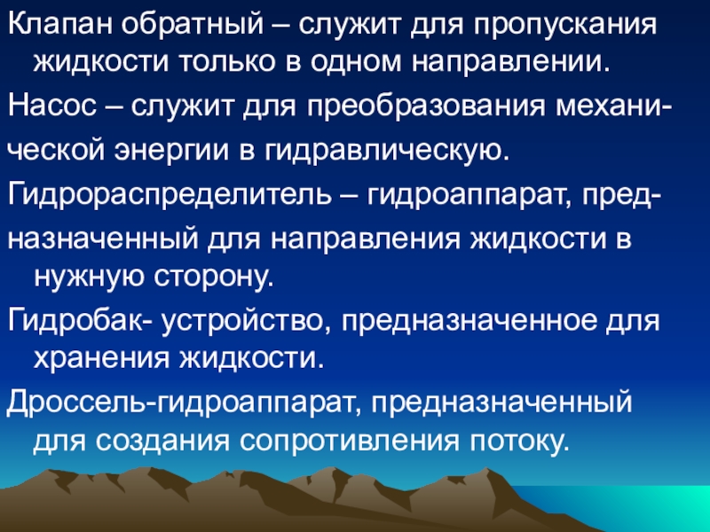 Клапан обратный – служит для пропускания жидкости только в одном направлении.Насос – служит для преобразования механи-ческой энергии