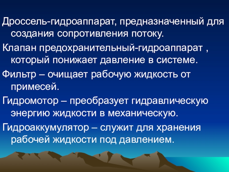 Дроссель-гидроаппарат, предназначенный для создания сопротивления потоку.Клапан предохранительный-гидроаппарат , который понижает давление в системе.Фильтр – очищает рабочую жидкость