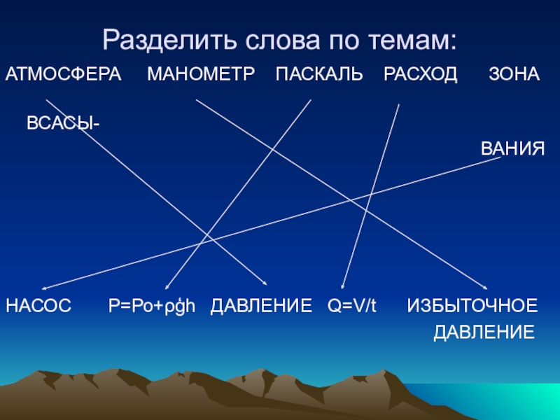 Разделить слова по темам:АТМОСФЕРА   МАНОМЕТР  ПАСКАЛЬ  РАСХОД   ЗОНА