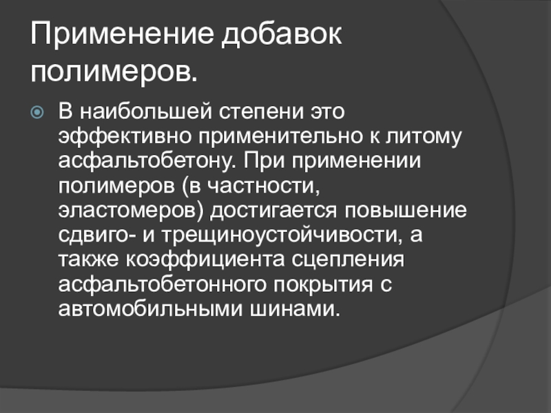 При применении полимеров (в частности, эластомеров) достигается повышение сдвиго- и трещиноустойчивости, а также коэффициента сцепления асфальтобетонного покрытия с автомобильными шинами.