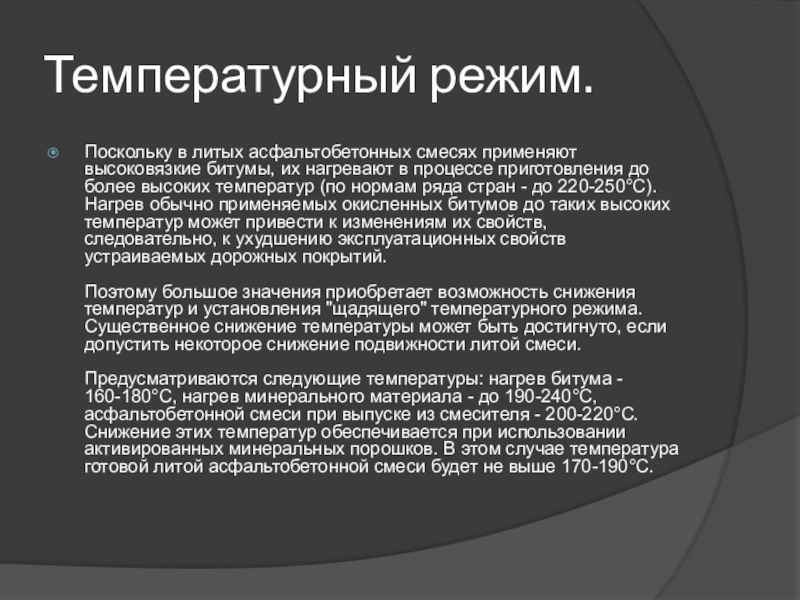 Предусматриваются следующие температуры: нагрев битума - 160-180°С, нагрев минерального материала - до 190-240°С, асфальтобетонной смеси при выпуске из смесителя - 200-220°С. Снижение этих температур обеспечивается при использовании активированных минеральных порошков. В этом случае температура готовой литой асфальтобетонной смеси будет не выше 170-190°С.
