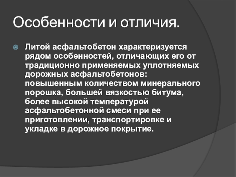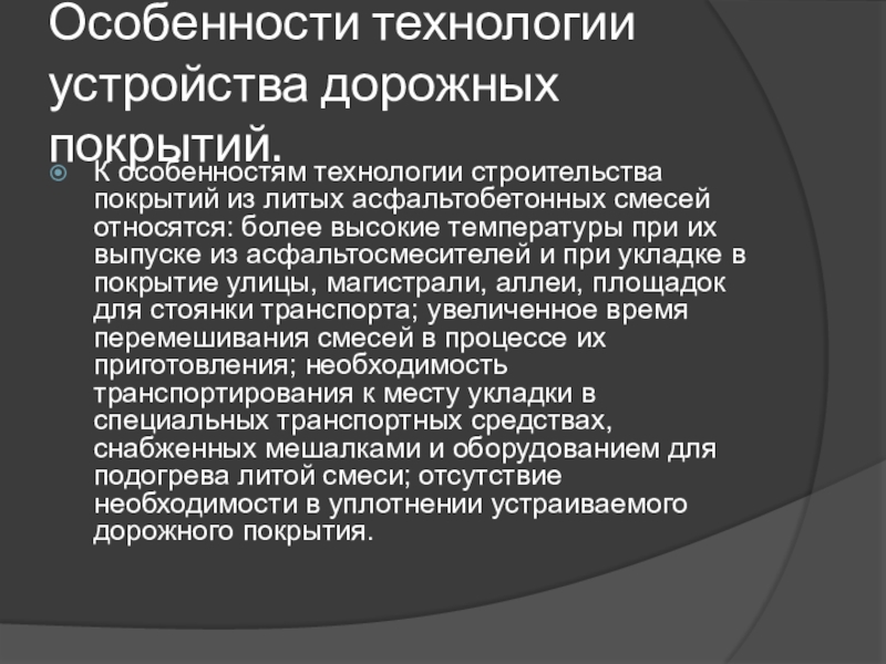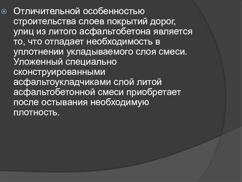 Слайд 4Отличительной особенностью строительства слоев покрытий дорог, улиц из литого асфальтобетона является
