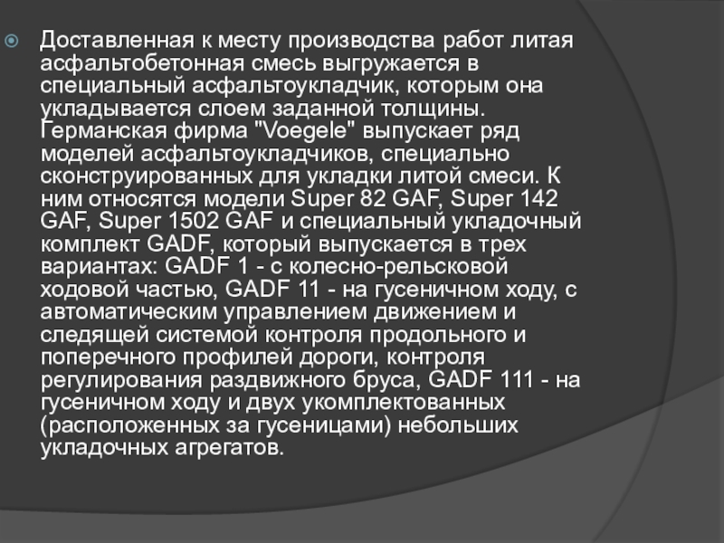 асфальтоукладчик, которым она укладывается слоем заданной толщины. Германская фирма "Voegele" выпускает ряд моделей асфальтоукладчиков, специально сконструированных для укладки литой смеси. К ним относятся модели Super 82 GAF, Super 142 GAF, Super 1502 GAF и специальный укладочный комплект GADF, который выпускается в трех вариантах: GADF 1 - с колесно-рельсковой ходовой частью, GADF 11 - на гусеничном ходу, с автоматическим управлением движением и следящей системой контроля продольного и поперечного профилей дороги, контроля регулирования раздвижного бруса, GADF 111 - на гусеничном ходу и двух укомплектованных (расположенных за гусеницами) небольших укладочных агрегатов.