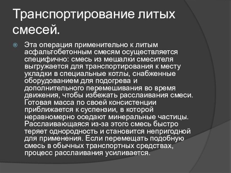 смесь из мешалки смесителя выгружается для транспортирования к месту укладки в специальные котлы, снабженные оборудованием для подогрева и дополнительного перемешивания во время движения, чтобы избежать расслаивания смеси. Готовая масса по своей консистенции приближается к суспензии, в которой неравномерно оседают минеральные частицы. Расслаивающаяся из-за этого смесь быстро теряет однородность и становится непригодной для применения. Если перемещать подобную смесь в обычных транспортных средствах, процесс расслаивания усиливается.