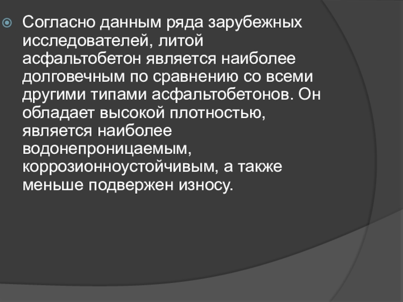 Слайд 5Согласно данным ряда зарубежных исследователей, литой асфальтобетон является наиболее долговечным по