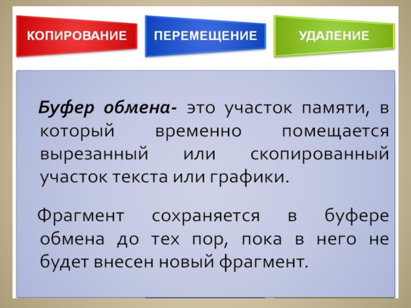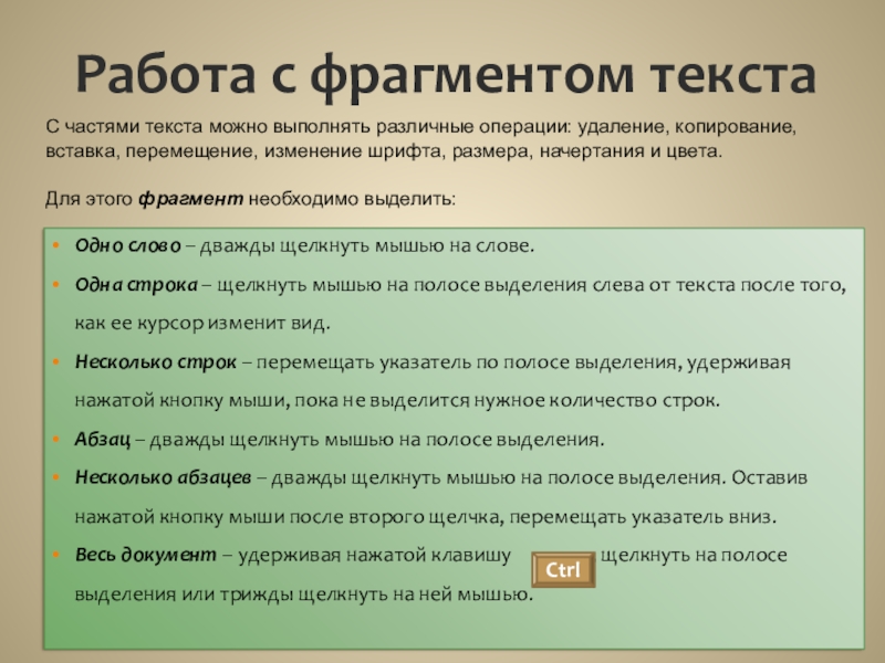 С частями текста можно выполнять различные операции: удаление, копирование, вставка, перемещение, изменение шрифта, размера, начертания и цвета.