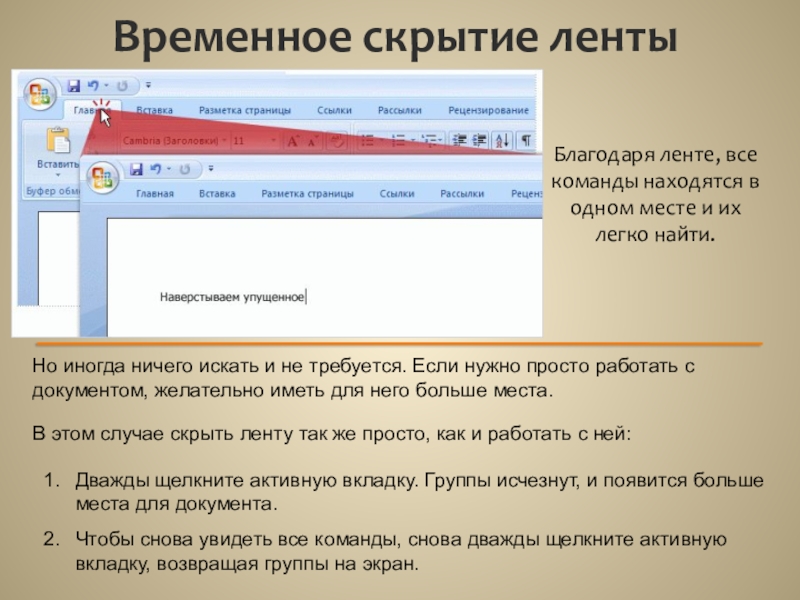 Дважды щелкните активную вкладку. Группы исчезнут, и появится больше места для документа.