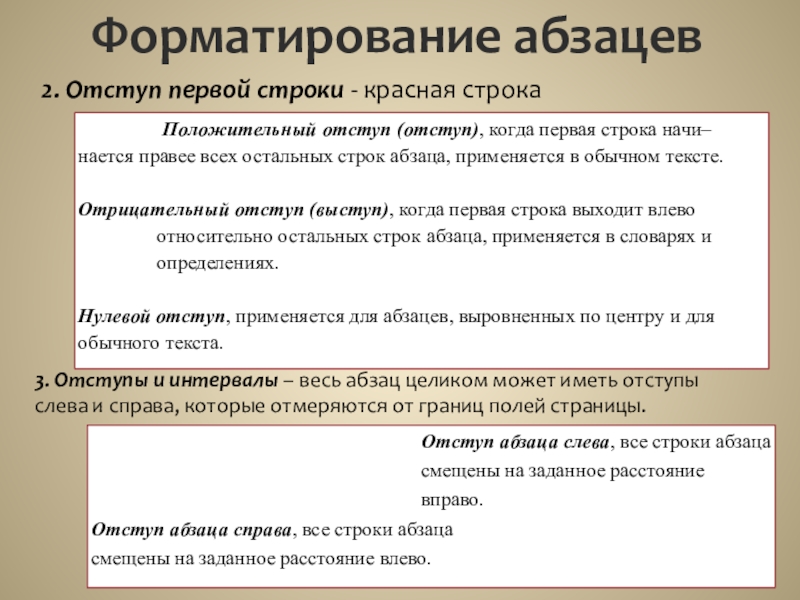 3. Отступы и интервалы – весь абзац целиком может иметь отступы слева и справа, которые отмеряются от границ полей страницы.