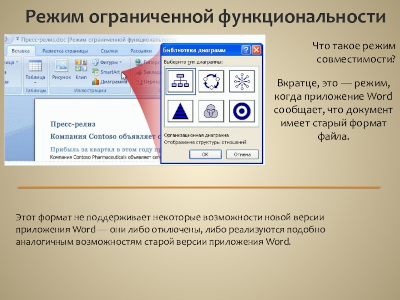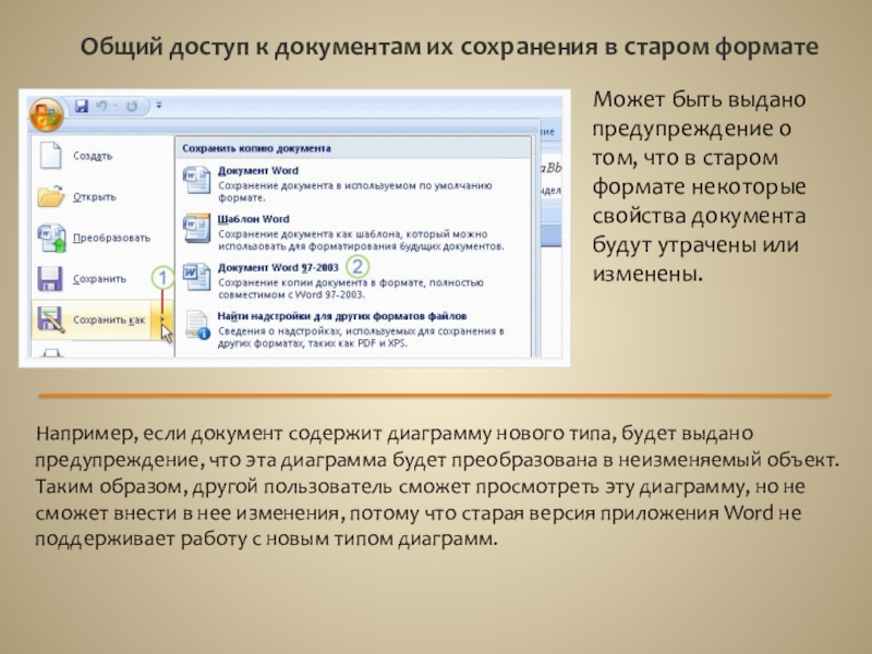 Например, если документ содержит диаграмму нового типа, будет выдано предупреждение, что эта диаграмма будет преобразована в неизменяемый объект. Таким образом, другой пользователь сможет просмотреть эту диаграмму, но не сможет внести в нее изменения, потому что старая версия приложения Word не поддерживает работу с новым типом диаграмм.