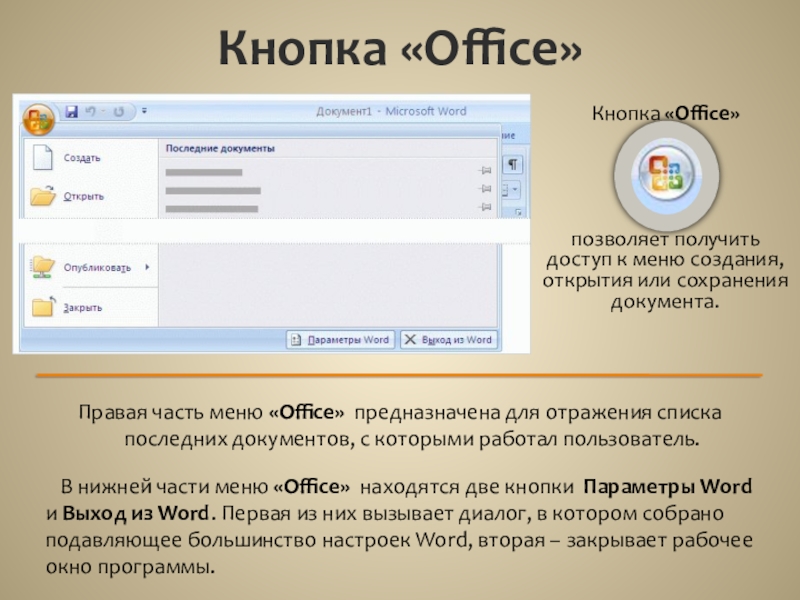 Правая часть меню «Office» предназначена для отражения списка последних документов, с которыми работал пользователь.