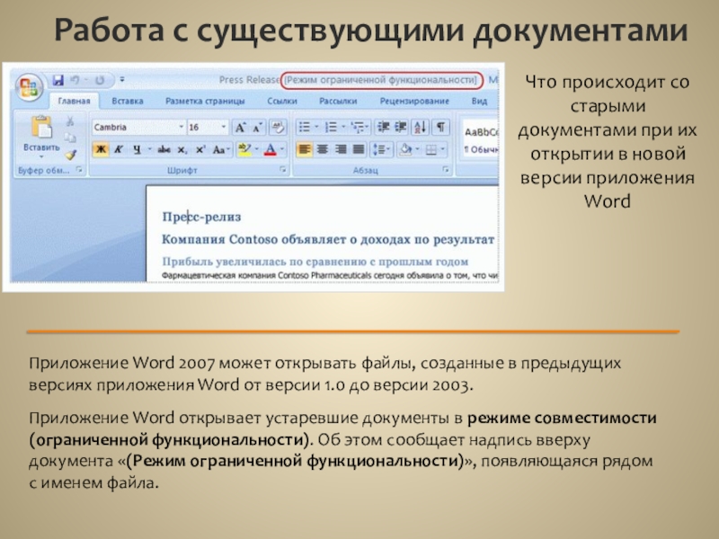 Приложение Word открывает устаревшие документы в режиме совместимости (ограниченной функциональности). Об этом сообщает надпись вверху документа «(Режим ограниченной функциональности)», появляющаяся рядом с именем файла.