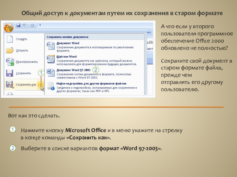 Приложение Word 2007 может открывать файлы, созданные в предыдущих версиях приложения Word от версии 1.0 до версии 2003.