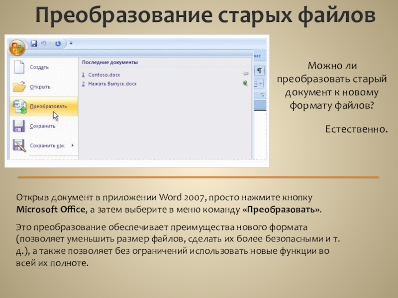 Открыв документ в приложении Word 2007, просто нажмите кнопку Microsoft Office, а затем выберите в меню команду «Преобразовать».
