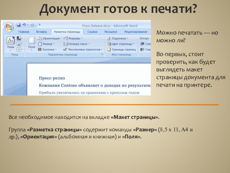 Группа «Разметка страницы» содержит команды «Размер» (8,5 x 11, A4 и др.), «Ориентация» (альбомная и книжная) и «Поля».