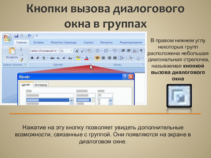 Нажатие на эту кнопку позволяет увидеть дополнительные возможности, связанные с группой. Они появляются на экране в диалоговом окне.